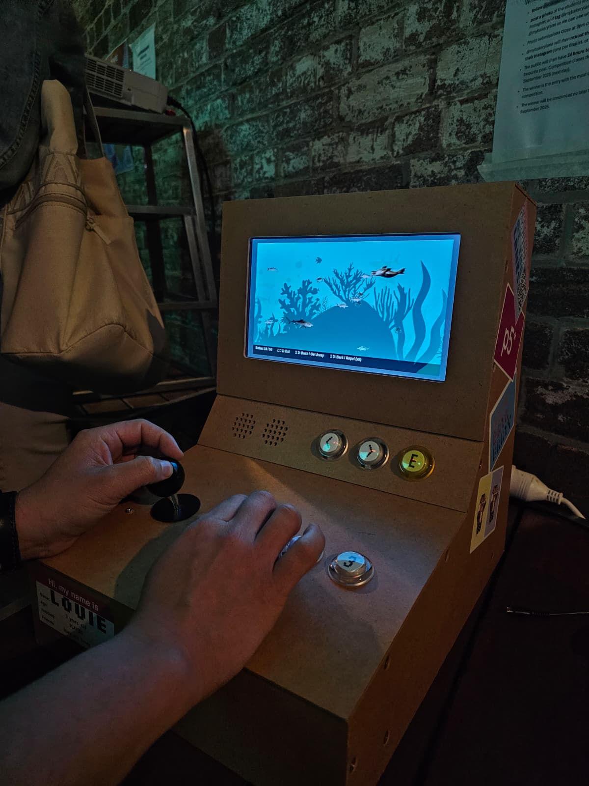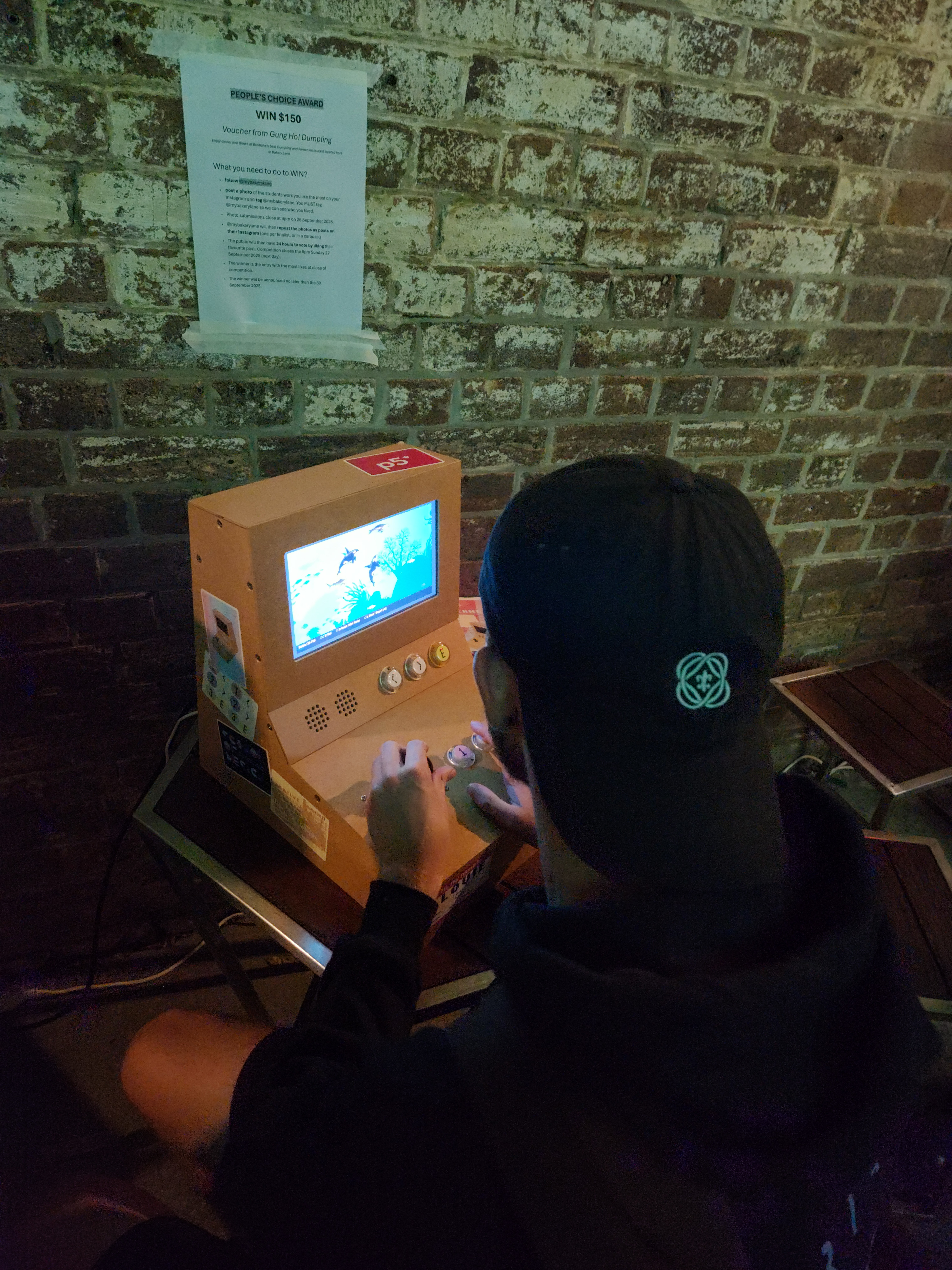 Playtesting with non gamers revealed early issues with clarity and difficulty. Improving the tutorial screens, HUD prompts, and predator speed made the game easier to understand within the first minute of play. At the exhibition, the arcade setup encouraged short, competitive sessions, with players gathering to watch and challenge each other. The cabinet, illuminated buttons, and quick onboarding helped the game hold attention in a busy public space.