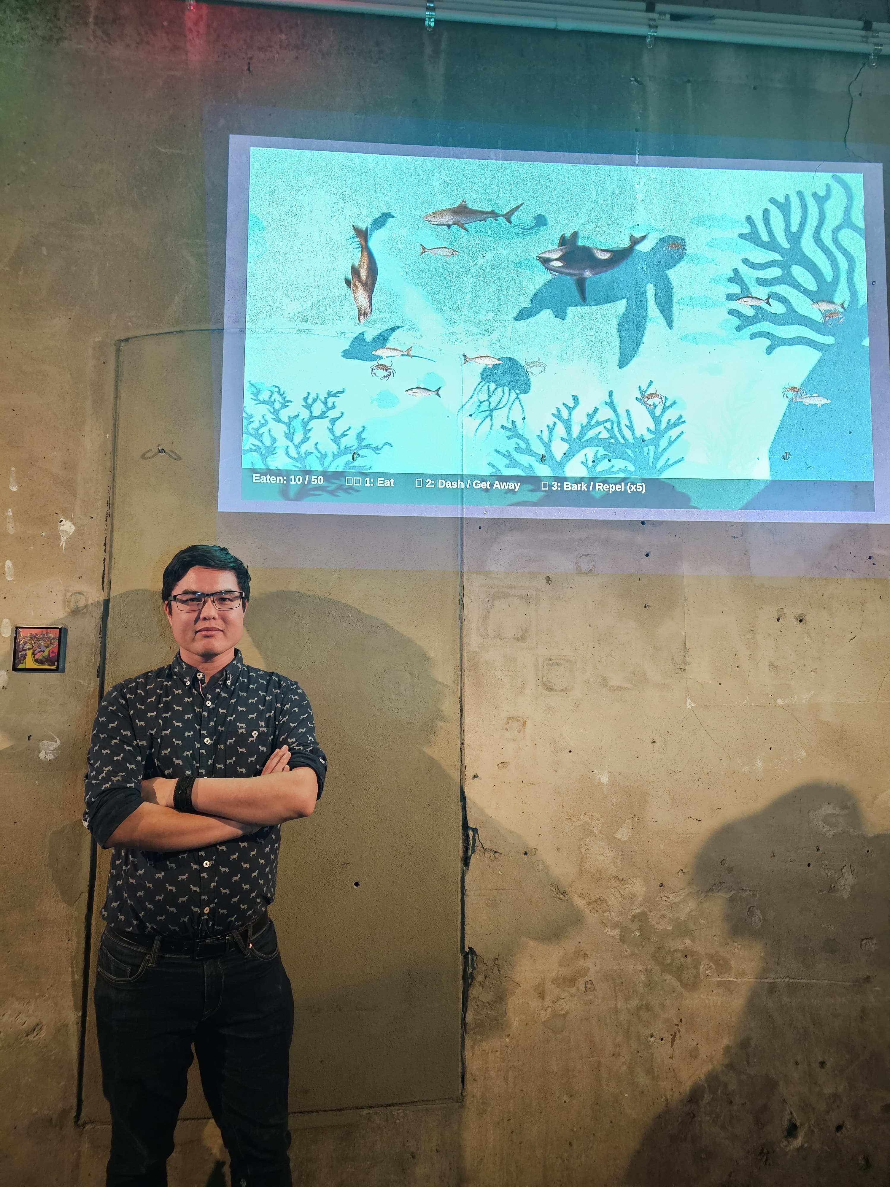 The concept began as an atmospheric exploration game inspired by classic arcade titles and Ecco the Dolphin, but shifted toward a score based survival loop to better suit the exhibition format. Development focused on clear silhouettes, quick feedback, and simple controls that felt responsive. AI generated sprites were refined for consistency, parallax backgrounds added depth, and iterative coding improved movement, predator behaviour, and pacing. Nearly a thousand lines of p5.js shaped an underwater world that balanced tension with flow.
